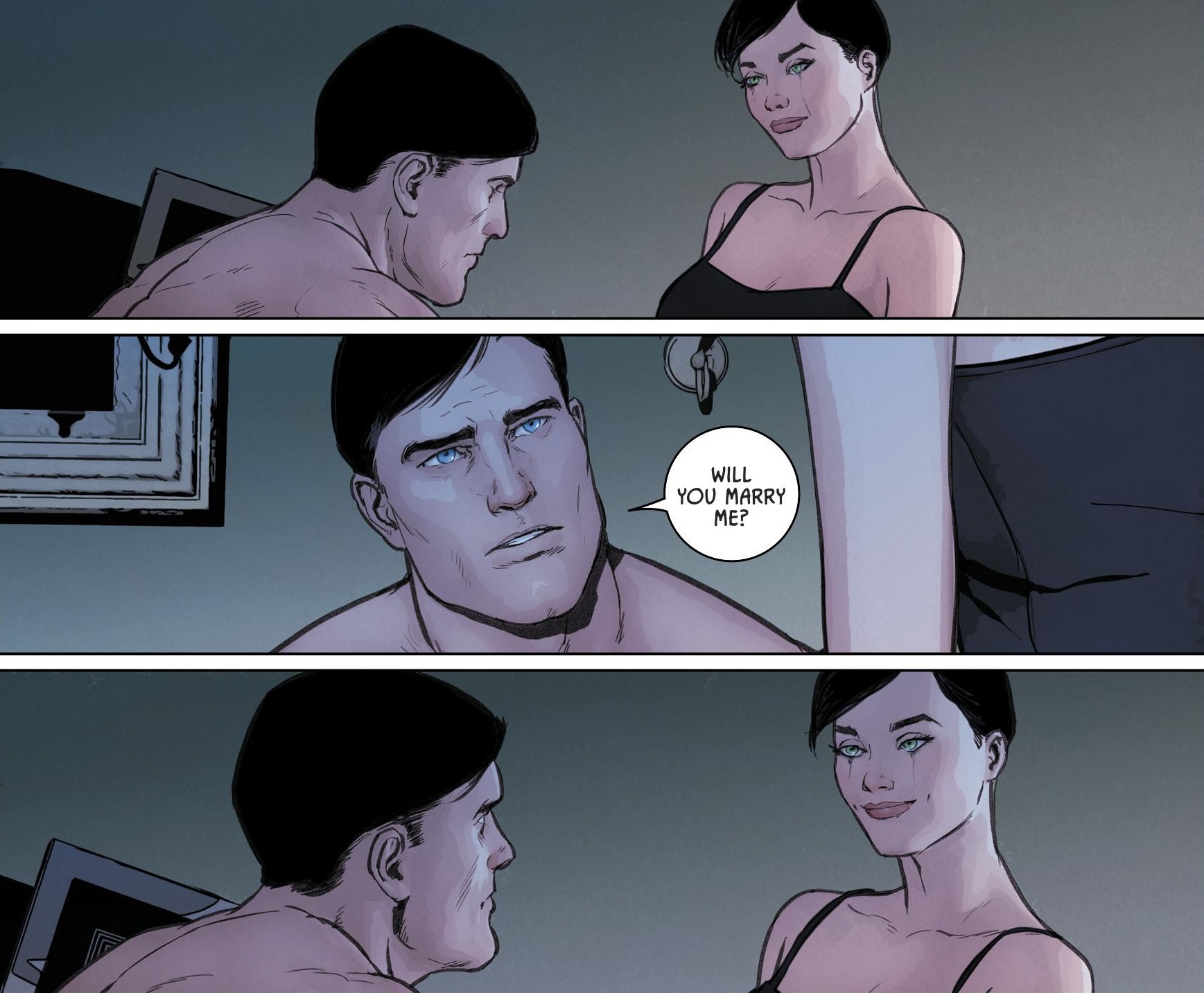 In the present, Selina tells Bruce that the difference between jokes and riddles is: Who cares? Bruce says that he is the man that Joker made him, but Selina counters that, sure, they’re both the people that life has made them. But so what? She has Bruce propose again, properly this time, and Selina says, “Yes.”