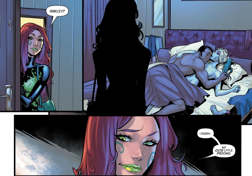 Harley Quinn is running for mayor of New York City, and she’s going undercover as a homeless person to get firsthand knowledge from people on the streets about what they want in the city. All her friends and allies have her back — especially Mason. After a late night food and Game of Thrones evening, he and Harley hook up, and which pleases Poison Ivy when she spots the two of them asleep later.