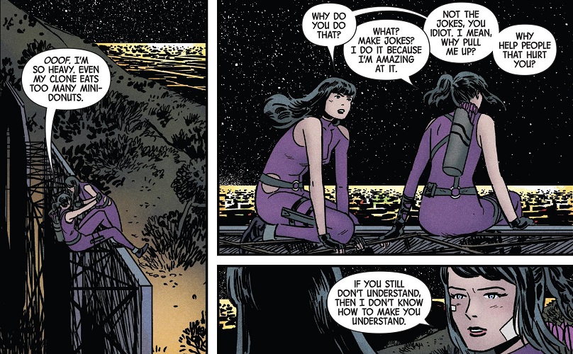 Kate Bishop asks her tied-up father if he killed her mother, and he can only hang his head in shame (he’s also gagged). Kate then heads out and finds Madame Masque, still posing as Kate in a clone body. The two do battle across the city and up to the Hollywood sign, where Kate saves Masque from falling to her death. Despite that, Masque still tries to kill Kate, but she’s shot by the timely arrival of Kate’s cop friend.