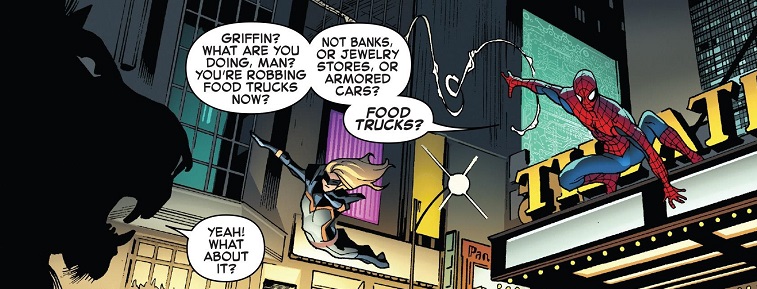 When Bobbi returns home and finds Peter back on her couch, she suggests they go out and swing around, because being superheroes is awesome. They find the Griffin attacking a food truck and kick his butt, with the crowd pretty angry at Spidey for being Peter Parker’s lapdog. It’s only when Peter saves the food truck from being destroyed — seeing as how it’s the owner’s livelihood — that the people end up happy with Spidey again. Then he and Mockingbird return to her place and start smoochin’!
