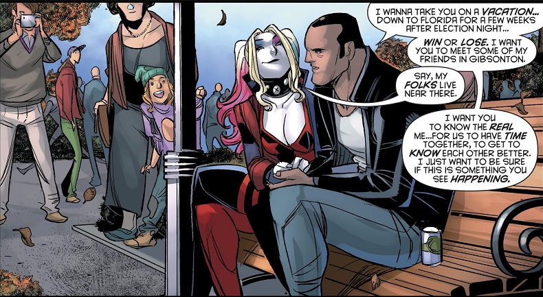 In spite of Scarecrow’s attack in the first debate, Harley Quinn is skyrocketing in the polls! Apparently people like it when one mayoral candidate beats up the others. Riding the surge of popularity, Harley has Poison Ivy launch a bunch of plant bombs, causing rapid plant grow around Central Park, as part of Harley’s promise to bring more greenspace to New York! As they deal with the aftermath of that mess, and prepare for the next debate, Harley spends some quality time with Mason, and he reveals that not only is he developing real feelings for her, but he wants to take her to visit his old life and friends down in Florida. Harley is all in favor of the idea. They’re getting really close.