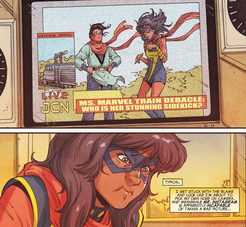 The media then converges on the area to interview the heroes, shoving Ms. Marvel out of the way to fawn over Red Dagger. Kamala stomps off, annoyed that she is so easily forgotten. And she decides that perhaps she should spend some time focusing on Kamala Khan instead of Ms. Marvel.
