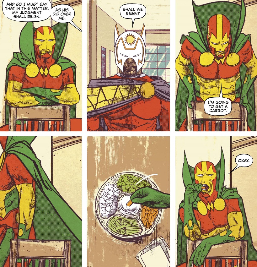 I love the disjointed feeling when King and Gerads juxtapose the ordinary with the weird New Gods stuff. Like Scott lazily getting out of bed and making coffee while Lightray, in full costume, informs him of the charges and trial. Or everybody eating from a veggie tray during Scott’s trial (with the spectators sitting on the couch).