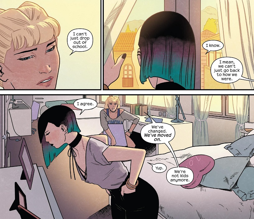 Gert, Nico, Chase and Old Lace show up at Karolina’s dorm room to recruit her to runaway with them! But the thing is, Karolina is really happy with her life. She’s going to college, she’s got a great girlfriend and she’s going to therapy to take care of any lingering anxieties from her youth — but the sudden arrival of all these old friends is putting a serious kink in her comfortability. She’s got a good life! How can they even suggest she throw it all away just to be a Runaway again? It’s not like they were a legit superhero team with a mission. They were just a bunch of kids stuck together trying to survive, because they didn’t have anything or anyone else. But now they’ve grown up. She’s grown up.