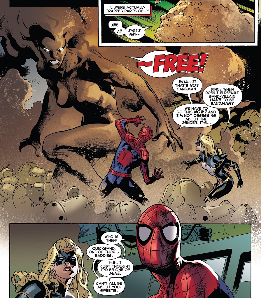These are a riot. There are a couple in the issue, and I giggled at each one. I totally approve of Mockingbird being the mega-equality feminist in the superhero community and I like the way Slott has fun with that. The Quicksand reveal is just great. Both the reader and Spider-Man expect it to be Sandman once it’s clear what’s happening, but then Slott and Mockingbird school us all! Good times.