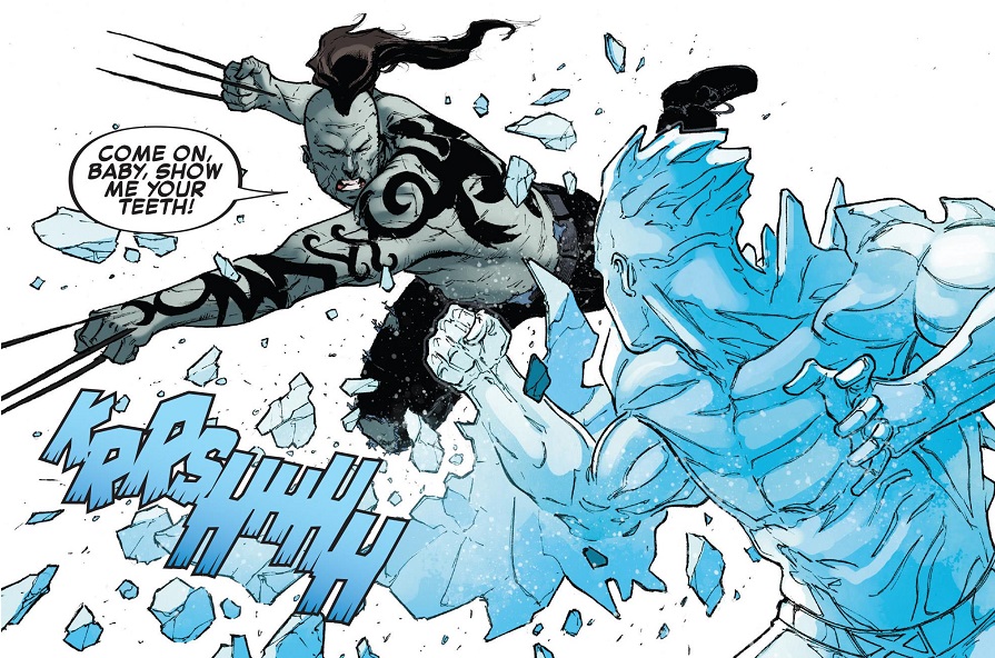 The fight with Daken is about as intense and wild as one can get. Iceman pulls out every stop, from creating an army of ice clones to weapons of all kinds to eventually just freezing Daken’s insides. He doesn’t pull any of that Omega-Level Mutant stuff we’ve all been waiting for, but he really goes all out in this fight. Daken is turned into a Mortal Kombat villain to make him as evil and menacing as possible. I’m not quite sure how he got away, unless Iceman just didn’t bother to follow through his final attack. But I’m always surprised when villains are able to slip away from heroes with super-powers.
