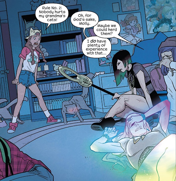 The Runaways take on Molly’s evil grandma and her army of telepathic cats, under Molly’s demands that they don’t hurt her grandma and they don’t hurt her grandma’s cats! Everybody dukes it out as best they can, until grandma orders the cats to launch a psychic attack, and that’s enough to push Molly fully over the edge to give up her grandma. Nico herds the cats out with a spell, but then a clone of Molly’s mom shows up to attack! As the other Runaways escape, Karolina goes full bright and puts an end to all of this nonsense!