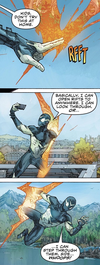 Derek James is your typical high school dweeb. He’s got adopted parents and a quirky, female best friend, and he’s picked on at school because his mom drives him. Back during Dark Knights: Metal, Derek fell through a something or other and got the power to make portals. He’s like the Spot, or like the video game Portal. His best friend made him a snazzy costume, and somehow he picked the name ‘Sideways’. He definitely suffers from the need for modern superheroes to be ‘kewl’.