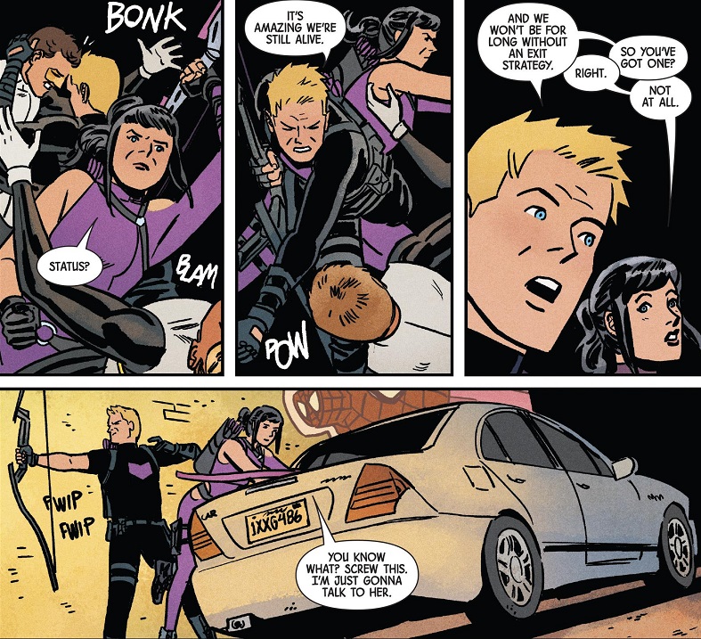 I feel like I’m being a bit too hard on this issue’s score. It was a fun comic, because of course it was. That is never in doubt when you’re reading Thompson’s Hawkeye. But I just don’t think this final issue reached any grand level of brilliance. It was a perfectly enjoyable finale, with a big fight scene and a big emotional ending — though all the emotion belonged to Eden, a villain I never truly understood, possibly because I never read that random spin-off comic where she debuted. I would have liked if Kate got the big emotional ending, or that it had focused more on Kate. But I suppose Kate giving the villain a stern talking to will have to do. At least she gets to keep having the best dialogue throughout the issue.