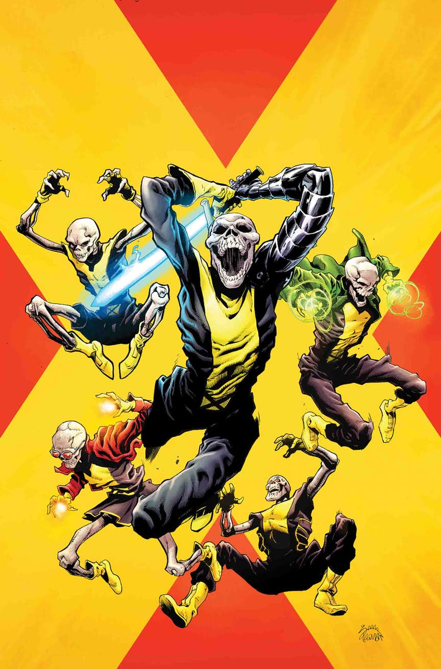 On the cover, the skeletons of all the characters are in action poses — except for Strong Guy, who appears to be falling backwards. That’s a pretty big clue.