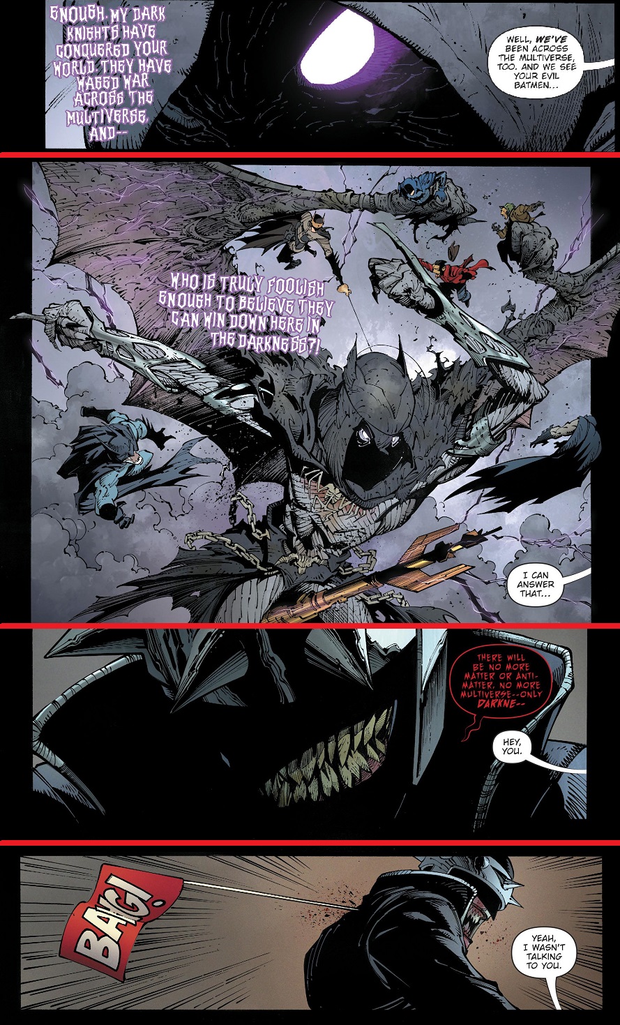 So Batman dives down to where they’re hiding (losing his armor in the process), and he takes on the Batman Who Laughs. Batman loses and is rescued by the Joker, who teams up with Batman to defeat their foe.