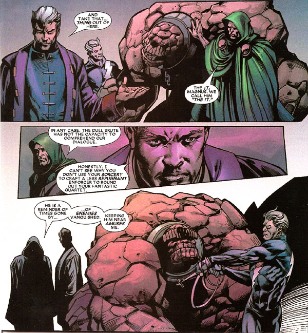 The grotesque It hails from the House of M universe, which was all about mutants, so the Fantastic Four got kind of a short shrift. Reed Richards did indeed launch a rocket into space, but he, Sue Storm and John Jameson all died. Ben Grimm became the It, a super-strong rock creature with diminished intelligence. He was scooped up by Doctor Doom, who started his own Fearsome Four with Doom at the head! Doom treated the It like a worthless pet, which eventually drove Grimm mad! He killed Valeria and Kristoff, the other team members, and goes after Doom, too!