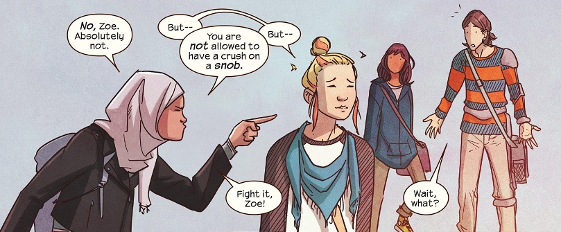 Of course, Kaylee’s stilted introduction is saved by Wilson adding the subplot that Zoe finds the girl instantly attractive! And it’s Zoe’s attempts to get to know her that reveal Kaylee as some kind of super-powered threat! The world doesn’t revolve around Kamala Khan!