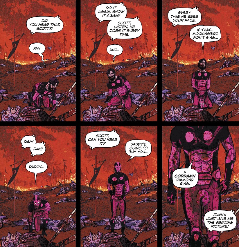 The issue intercuts two stories: either Mister Miracle on the battlefield, drenched in blood, slaughtering his enemies, suffering through emergency leg surgery, digging a trench in which to store the dead and other gruesome scenes; or Scott Free at home taking care of his baby. Scott and Barda are switching off who is home with the baby and who is at war. And oftentimes they chat on the Mother Box phone while the other is in battle. It’s kind of adorable. The issue is just back and forth: raising a baby, fighting in a war, raising a baby, fighting in a war.