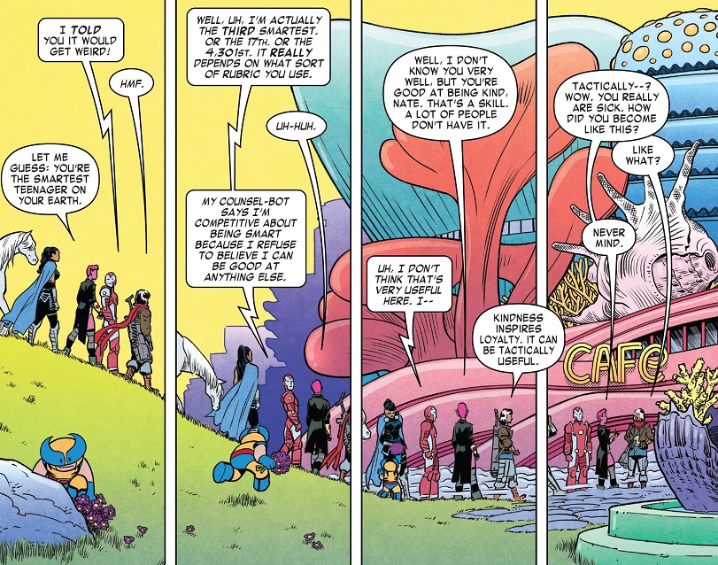 Or how about the extended bit where Iron Lad randomly questions Valkyrie on what name they should call her, while they’re traveling between dimensions. And when she gives him an answer about being a tough Asgardian warrior, Khan comments that Valkyrie is intense! No! That’s Khan’s character! Why is Khan remarking that someone else is intense when Khan is supposed to be the most intense?!