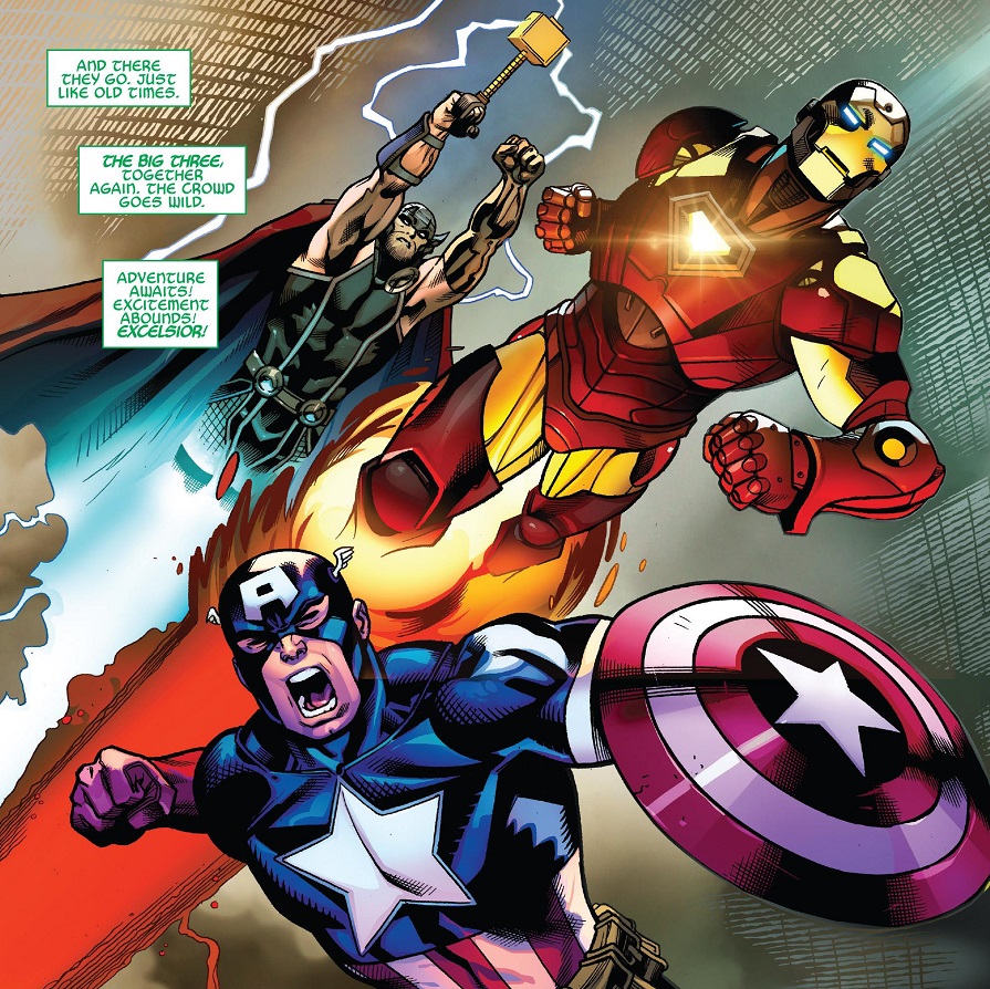Captain America, Iron Man and Thor do battle against the new Final Host evil Celestials, though they are like gnats to the giants. I think one of the dead Celestials gets up to lend a hand, but he gets his head lopped off. Meanwhile, some dark, smarmy force is watching from the wings and narrating. See if you can guess who it is based on context clues I’ve given so far.
