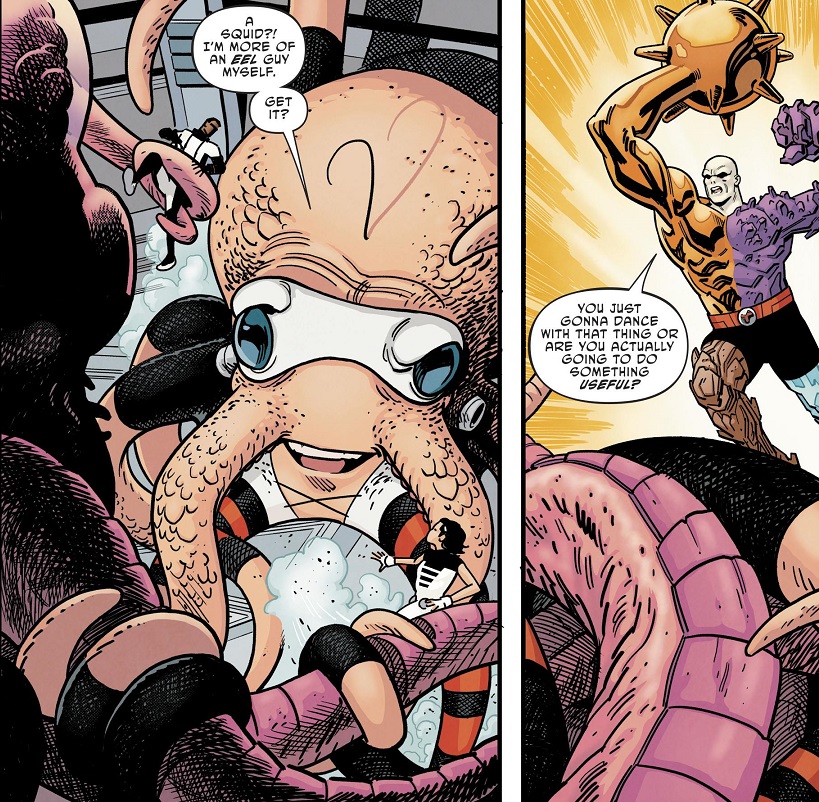 Mr. Terrific has decided to take the team on a field trip to return Phantom Girl to her home planet of Bgztl, because it’s a nice thing to do. They head out into space, but are pulled out of hyperspace by a junker ship grabbing them for scrap (though we find out later that somebody planted a tracking beacon on them, attracting the junker). Once on board the ship, the Terrifics have to fight a garbage disposal monster, the space pirates that operate the junker, and then the garbage disposal monster’s parent. They get away and continue their trip to Bgztl.