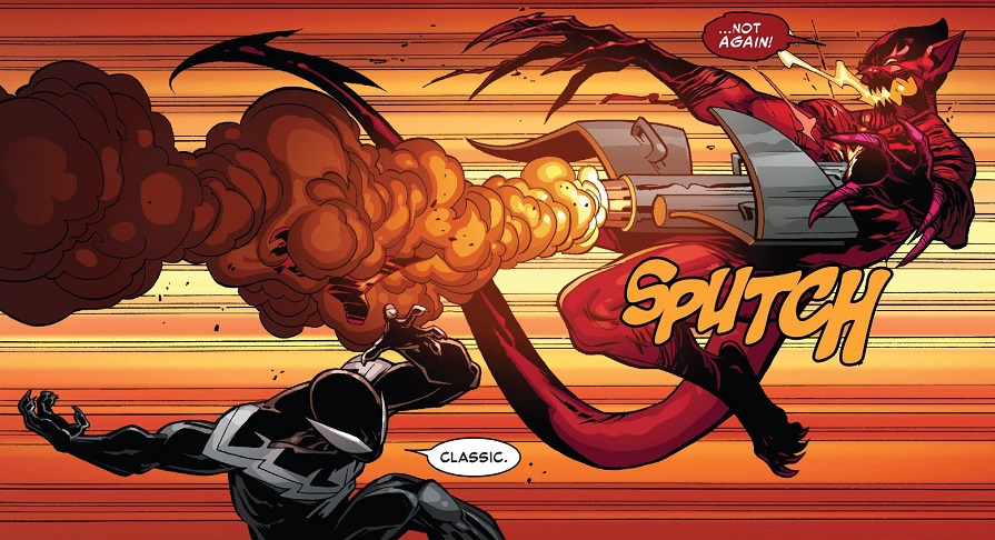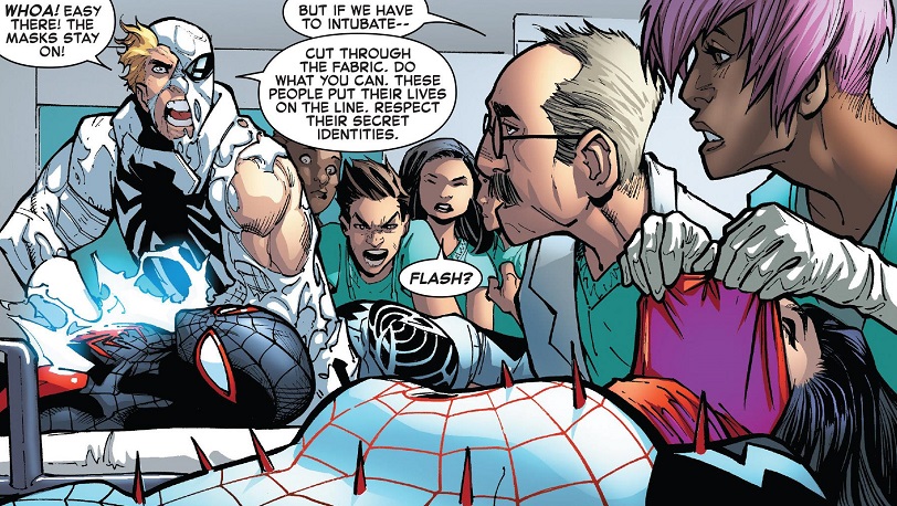 This issue was also a little too jam-packed for some of the more dramatic moments to land. Red Goblin snapping his fingers to kill everybody with the Carnage slivers is immediately followed by a panel of him announcing that it didn’t work, and Flash showing up at exactly that moment to explain it. All the artists did a great job of showing those slivers still in people’s bodies throughout the issue, so the foreshadowing and build-up was great…but then the moment is over in a matter of seconds, and then we’re immediately told it didn’t even matter. Moments like that should have had more time to breathe, but the story and art were too jammed in there.