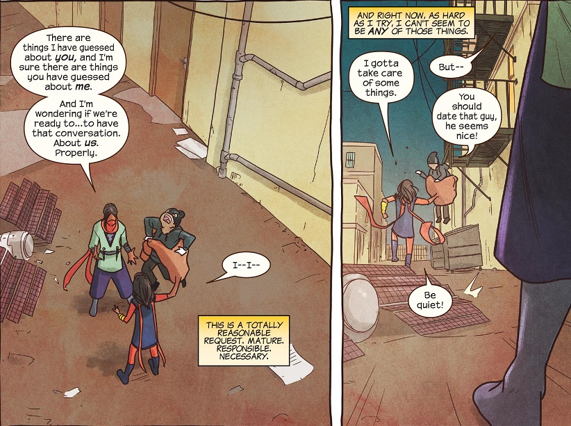Honestly, I’m a little disappointed at how smoothly everything wraps up in this issue. Like, for a moment, it seemed Wilson was really going to twist the knife with everything she’d set up. She had Doc.X infiltrating Kamala’s school, all while knowing her secret identity and holding that over Kamala’s head. She had a great love square going on with Kamala, Bruno, Mike and Red Dagger. She introduced a school dance, always a great opportunity for good high school drama. But everything is closed off nicely by the end of the issue. Doc.X’s threats never materialize and he’s soundly exposed and defeated with nary a concern. Red Dagger simply goes away, solving Kamala’s relationship drama for her. Mike and Bruno easily bury the hatchet. And Kamala and Bruno are simply thrust back together no biggie like. Even Zoe’s relationship woes are solved quite effortlessly.