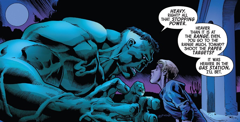 Like, nothing much is made from the new ‘Immortal’ adjective in the title. Yes, the Hulk shows up after Bruce is dead and already at the morgue, but so what? How would this story have been different if Bruce turned into the Hulk as soon as he was shot in the mini-mart? How does Bruce dying and then Hulk coming back to life a couple hours later mean anything special? I’m more than willing to give Ewing a chance to show me what’s so new and special about this title, but I don’t see it yet in this first issue.