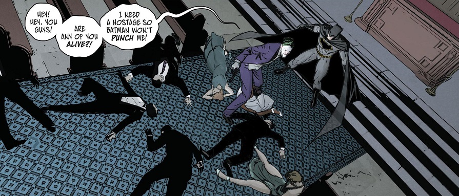 The No. 1 takeaway from this issue was, for me, that Batman is an idiot for letting the Joker live all these years. This issue was legitimately painful to read in a palm-to-forehead sort of way. Joker slaughters this beautiful wedding party, including a pretty graphic scene where he takes the bride hostage, holds a gun to her head and then accidentally lets it go off, creating a running gag for the issue. It’s gruesome. And you just know that nobody will ever care about all these dead innocents. Batman just stands there letting the Joker blabber on about this and that, and you just know that Batman won’t do anything to the Joker. Even when the Joker holds a gun to his own head and holds himself hostage, you just know Batman’s going to move Heaven and Earth to keep the Joker from killing himself. Because that’s how Batman rolls when it comes to this clown.