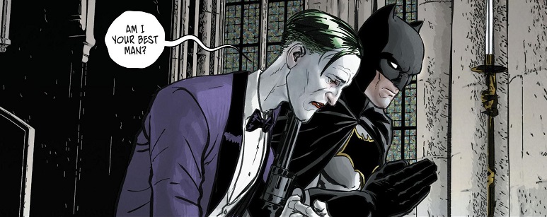 The Joker found out that Batman is getting married, so he kills everybody at a wedding to get Batman’s attention. When the Caped Crusader shows up, Joker rambles crazily about love and lessons from his mother and various other babblings. Batman pretty much just stands there and listens, because Joker either points a gun at Batman or points a gun at himself. Then the Joker gets Batman to pray at the altar with him, where there’s a bomb and Batman takes the worst of it. Joker then aims his gun at the knocked out Batman, while outside, Catwoman decides to get involved after all.
