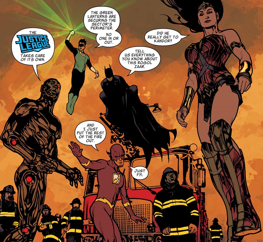 Superman yanks Rogol Zaar all the way to the moon to continue the fight safely away from Earth, but Superman gets his butt whooped and Zaar takes off. Down on Earth, Deputy Fire Chief Moore is still investigating the arsons when she and her department get called out to another fire. Supergirl flies in to help rescue people, and the Justice League shows up to put out the fire. They are looking for Superman, and Supergirl rescues him off the moon. They take Superman to recover and talk out who Zaar is and what he wants. Why did he never appear in any of the Kryptonian writings that Superman has studied? While chatting, they realize that Zaar is probably going to cleanse the entire Earth just to get rid of Superman, so Supes has to punch his way into the very core of the planet to fight Zaar again!