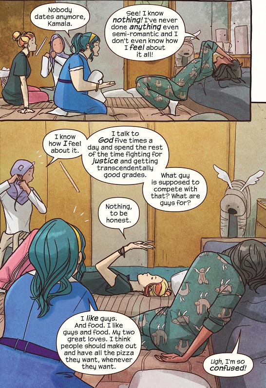 By the end, after missing so much slumber party time, and leaving her friends hanging, Kamala steps into her bedroom and reveals to them all that she’s Ms. Marvel — which, of course, they already know. It’s been obvious for a long time. They just didn’t want to step on her toes about the reveal. Kamala is super-relieved and everybody group hugs and promises to be the best friends ever!