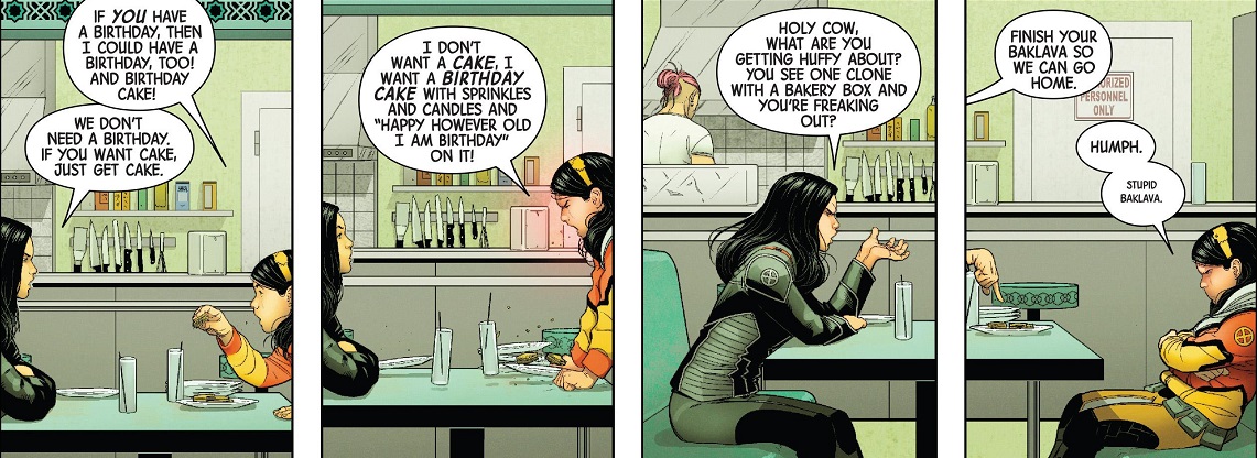Beyond that sin, the comic is otherwise great! Tamaki has a great handle on her lead characters, using the birthday thing to really showcase Laura and Gabby’s personalities. It’s a fun angle to explore for a pair of clones, and I especially loved Gabby’s juvenile petulance. Tamaki nails the character.