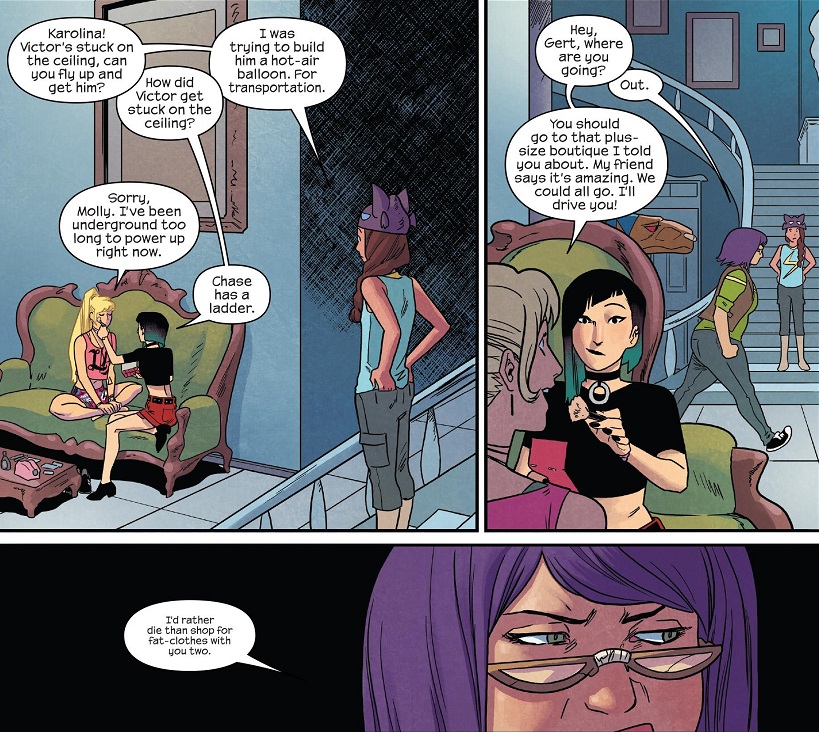 It’s a chilling-at-home sort of Saturday. Doombot shows up to give Victor a new body, but Victor doesn’t like the buff, weaponized Transformers body that Doombot makes, though Victor isn’t being particularly forthcoming about his hang-ups. Gert storms out for some alone time, since it’s still too weird for her being around everybody. She sees that the world has changed when it comes to purple being a rebellious hair color, so Gert buys a new outfit and some brown hair coloring in order to make a new her. Everybody is pretty awestruck at her new look — except Molly, who is excited that she and Gert have the same hair color, like sisters, and that they’re ordering pizza for dinner.