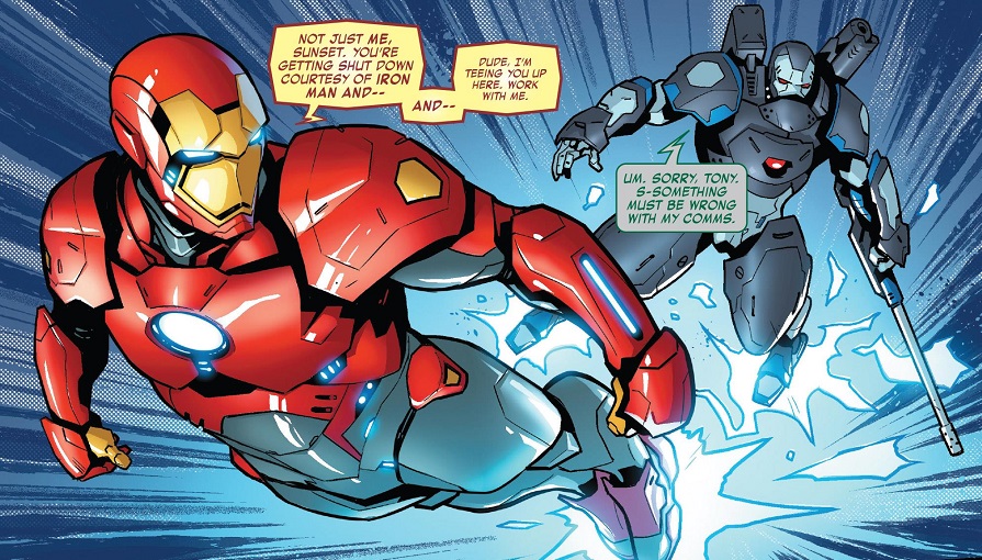 Having recently come back from the dead, James Rhodes hasn’t been feeling 100% lately, but he’s keeping that to himself. When Tony has him suit up as War Machine to stop Sunset Bain’s latest super tank (built with stolen Stark Tech), Rhodey freaks out in the field and bails from his War Machine armor — only to come through in the end by taking direct control of the super tank (called The Manticore). Afterwards, Rhodey comes clean with Tony that his PTSD from dying has him freaking out when confined in the armor, but he rather likes feeling like a pilot again in the cockpit of the Manticore. So Tony’s buys it from Sunset Bain.