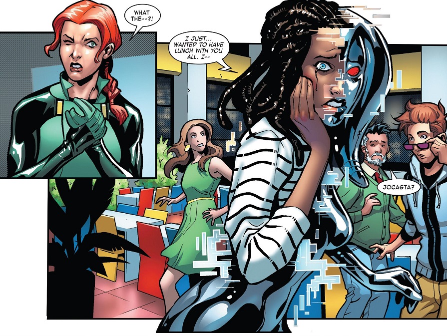 This comic is just so much fun! Pretty much every character is interesting, and Slott has no problem adding new and even more interesting characters! He brought back The Gauntlet! He has the Machine Man dating Jocasta and getting into arguments about robot rights! He turned Friday into an android of her own and started toying around with the very idea of robot and A.I. rights. It’s neat! And the scene where Jocasta is embarrassed in the cafeteria is heart breaking! She just wants to fit in!