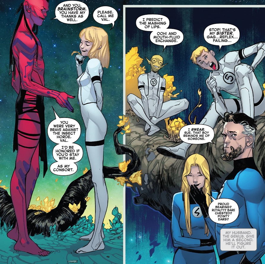 I very much enjoyed this issue for its feeling of light-hearted happiness. There’s a gentle, friendly, family-oriented sequence at the beginning about how much fun and how rewarding it is for this crew to travel from universe to universe, studying science and making lives better. There’s an especially nice scene between Reed and Sue. And seeing the older, more mature Franklin and Val is good too. I like the idea of aging them up a little bit. Because why not? There’s no reason to keep them as kids forever — though I’m not sold on their new superhero names, but more on that in a bit.