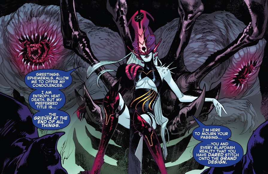 Though I can totally see where Entropy is coming from with all these makeshift, cobbled together universes just shoved into the natural order of the multiverse. If she is indeed a cosmic entity, she’s got a job to do, and these random humans from Earth 616 are mucking everything up!