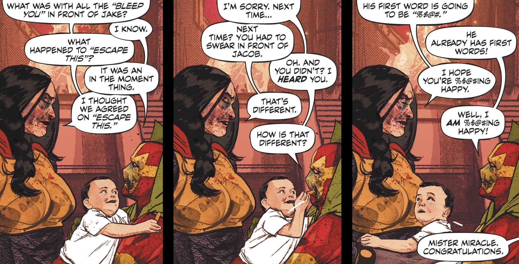 Mister Miracle and Big Barda teleport to Apokolips to complete the exchange: their son Jacob for peace with Darkseid. They go through with the exchange, with Darkseid pulling out his own eye as his part of the deal, so that he can’t use the Omega Beams. But when Scott asks for one last chance to say goodbye to his son, he grabs the boy and the plan is on: Barda uses her stroller to blast Darkseid with a super energy beam from the Miracle Machine, but Darkseid survives the blast and knocks her out. Darkseid then beats down Scott, who pulls a Fahren-Knife out of the vegetable tray and stabs Darkseid in his empty eye-socket. Scott angrily explains that the knife was made from Orion’s corpse, who was prophesied to be the only one who could kill Darkseid!