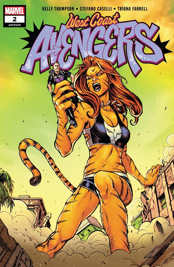The West Coast Avengers take on the giant Tigra, with the help of B.R.O.D.O.K., who they all assume is really M.O.D.O.K., just in a studly surfer dude body (with a slightly bigger head). After B.R.O.D.O.K. gets Tigra to leave, Kate invites him back to base so that he can be pumped for info. She leaves B.R.O.D.O.K. with the others while she and Clint investigate his Advanced Image Mechanics office downtown, grabbing a bunch of files on clients and figuring out he’s the one who probably turned Tigra into a giant.