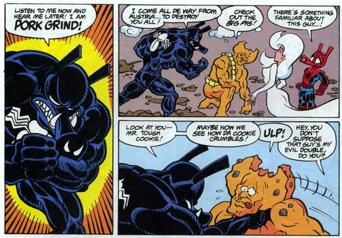 Honestly, I’m not even sure if Pork Grind is a symbiote or not, but he fits, because I’m still feeling silly. Pork Grind is an enemy of Spider-Ham, the character wherein Spider-Man is now a pig person. In his original appearance, Pork Grind simply looked like Venom and was therefore chosen to be Spider-Ham’s enemy. They had one encounter early on, and the bad guy was defeated. Then Pork Grind was resurrected recently for the Spider-Man Unlimited mobile game, which went a little symbiote crazy. And Pork Grind was recently featured in a Venom-themed line of Marvel Legends action figures! They basically just had a Venom figure and gave collectors a Pork Grind head to switch out. That’s pretty neat!