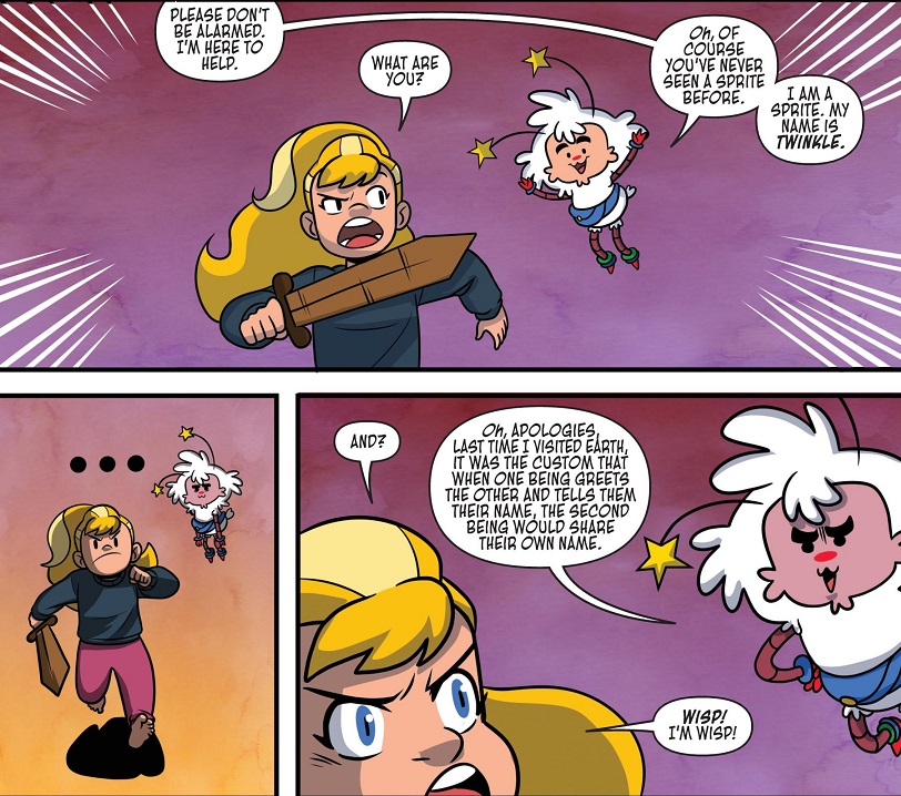 It’s fine, though I was hoping for more. That’s probably on me. I didn’t know what to expect going in, but I had a lot of different hopes that were based on nothing but my own pre-conceived imaginings. Maybe this is supposed to be a lower key story, just looking to be a friendly, all-ages book without many stakes. The issue is largely just the two girls playing, which is nice, but there’s not much to it. The flight from the monsters is equally low key, with Twinkle just showing up and delivering some exposition. I dunno, I guess I was just hoping for a deeper, richer introduction to what this comic is going to be about.