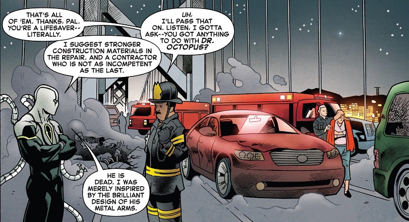 Otto Octavius is currently living his best life as the superhero Superior Octopus in San Francisco. He’s living in a perfect clone body that’s half himself, half Peter Parker. He’s posing as a super smart, super handsome professor at Horizon University, where he gets to interact daily with Anna Maria Marconi, and he’s slowly making waves as an unconventional superhero. Of course, the people of San Francisco are a little hesitant, considering he’s modeled after Doctor Octopus, and he did work with HYDRA when they took over the country…But at least he’s now aware of how sick his wooing of Anna Maria was back when he was posing as Peter Parker, so he’s promised himself not to romance her, merely to be friendly, polite and protect her from afar (which is still a little creepy, but at least he’s learned from his mistakes).