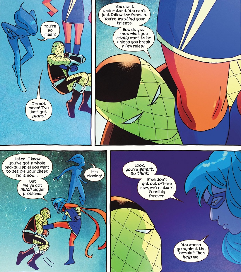 In their efforts to avoid the Shocker, Kamala and Bruno wind up back in the weird interdimensional void, and Bruno explains to Kamala the mechanics of her powers. They bounce back out and Kamala takes on the Shocker, while Bruno goes to shut down the wormhole experiment. Kamala and Shocker wind up back in the other dimension again, with Shocker trying to convince Ms. Marvel to go against her pre-conceived superhero notions and join him in pushing through the void to something bigger and better! With Singularity’s help, Kamala defeats the Shocker and sends him portaling back to Brooklyn. Then she rejoins Bruno before he shuts down the wormholes, and they go out to grab a bite to eat.