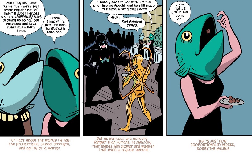 Anyway, ignore that, I’m just grousing because that cliffhanger reveal did not live up to the utter hilariousness of the preceding funeral scene. Ryan North is at his absolute best in that scene, whether he’s giving mini-euologies to a who’s who of hilarious cameos, or he’s having Nancy and Doreen try their darndest to stay in character as the ridiculous fish-headed superheroes while attending Doreen’s funeral.