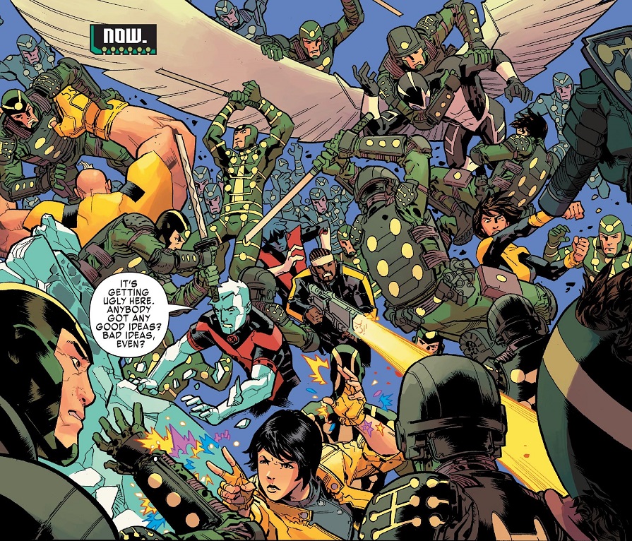 Everything is one big, insane clusterfuck of Multiple Men. Royal Grand Vizier Madrox has brought the evil army of Madroxes from the future to fight the X-Men. He also sabotaged the most recent group of time-traveling Madroxes with a bomb, which not only wipes them out, but also wipes out the evil future. So that’s all taken care of.