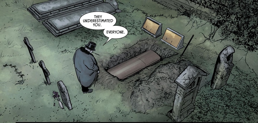 Anyway, once we get through it and Batman confronts Penguin, the villain reveals he has Alfred in the sniper’s sights — but then he orders the sniper to kill himself instead. Penguin tells Batman they have much to discuss.