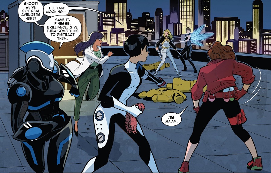 AIM is attacking the lab, and Nadia and Ying rush inside to save their friends, while Janet and Bobbi head to the roof — to chase after the girls, but they mostly end up fighting AIM goons on the roof. Inside, Nadia runs into Finesse attacking Alexis and Taina, and Nadia gets her butt whooped by her father’s former protege. Finesse escapes with a pair of science gloves by shrinking Taina, forcing Nadia to shrink down and save her. Elsewhere, Seeker has taken Lashayla hostage to get her to give up portal technology, but Ying confronts them in a stairwell. She keeps Seeker talking while Lashayla secretly activates Seeker’s jetpack, sending her to the roof (Ying also uses the “girlfriend” word and it’s quite adorable).