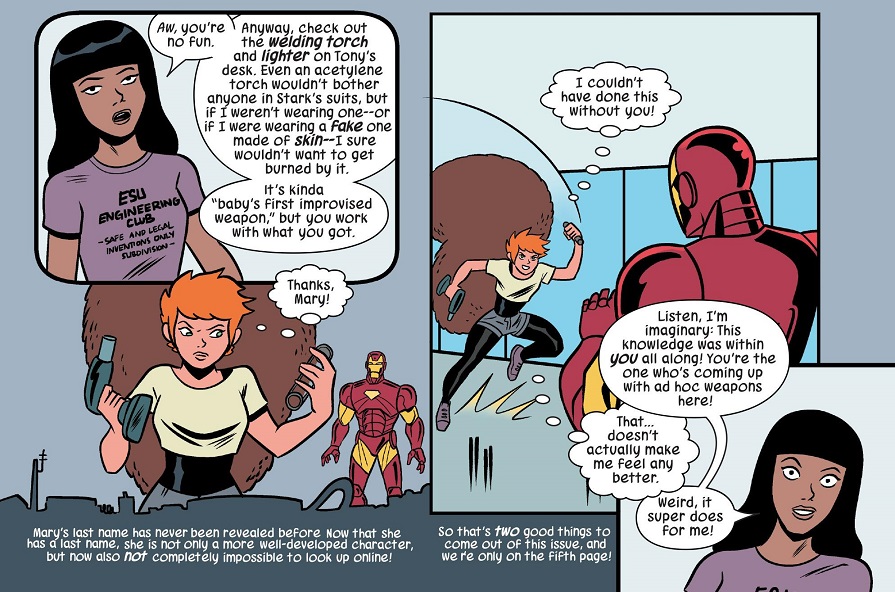 How does Ryan North call me out? Check this out and you tell me. While fighting Fake Tony Stark, Doreen runs through a bunch of ‘what would my friends do’ thinking. She settles on Mary, who helps her come up with the blow torch idea. On the page, North finally gives Mary a last name: Mary Mahajan. And that reveal comes with a specific North notation at the bottom of the page.