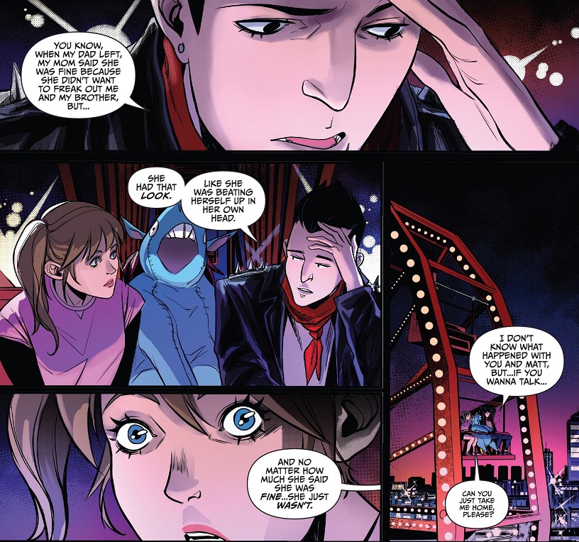 As for the rest of the issue, it was great. It’s got a strong character focus, which I love, with some wild action. The idea that Jason and Trini are also sharing some thoughts and memories came out of nowhere, but Parrott uses it well to work on both characters. Their kiss is well earned and I look forward to how this storyline is pursued. Likewise, despite my reservations above about Skull, his scene with Kimberly is also strong, character-wise. Kim has a lot going on and the date is used well to elaborate on it.