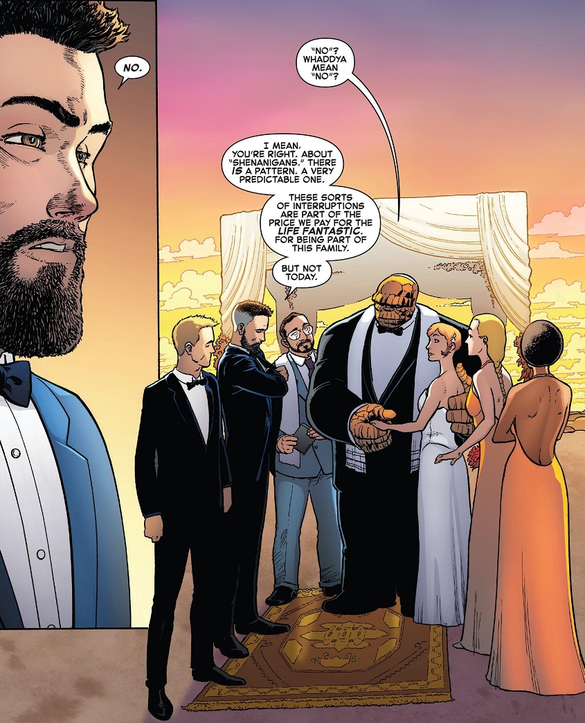 First of all, Reed’s moment of brilliance was great. We obviously knew he was up to something when they kept trying to shame him for not being a bigger part of the wedding prep. And when he simply said “No” to the idea of the team rushing off to fight Doctor Doom, like you knew would happen, it was a powerful moment. For a second there, I was expecting him to just say, “The world will survive for another couple of minutes without us”, but then to have him reveal why he was so distracted was great. His declaration that protecting the moment of the vows became his “highest priority” was damn good stuff, and it paid off wonderfully.