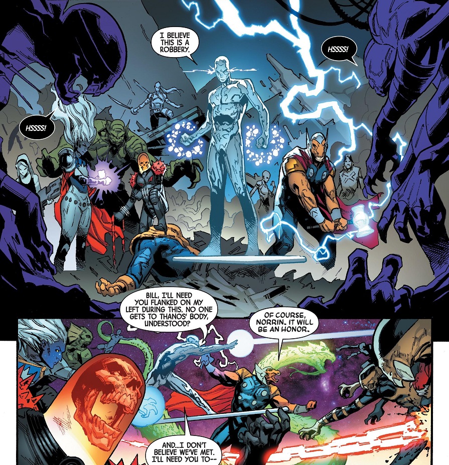 The two of them were headed to Knowhere to get drunk, but Knowhere is not in its usual spot. Instead, it’s been seized by the Black Order to use in a raid on the assembled cosmic heroes. The Black Order force their way in, fight everybody and steal Thanos’ body (his head is still missing). The Black Order escape by punching a hole into time and space, which sucks everybody inside — until Stormbreaker launches out, attached to one of Cosmic Ghost Rider’s chains. The makeshift anchor crashes into Star-Lord’s ship and he and Groot pull out Beta Ray Bill, Cosmic Ghost Rider, Phyla-Vell and Moondragon, whom Peter declares as his new crew in order to protect them from the inquisitive Nova Corps.