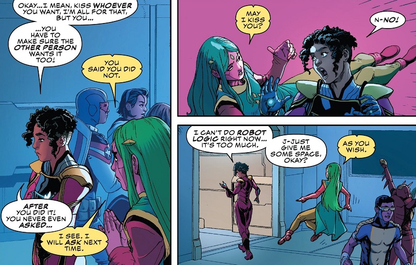 Also, there’s some drama still brewing after Viv Vision kissed Riri Williams in a previous issue. Viv flirts like a robot, and Riri is uncomfortable about the whole thing.