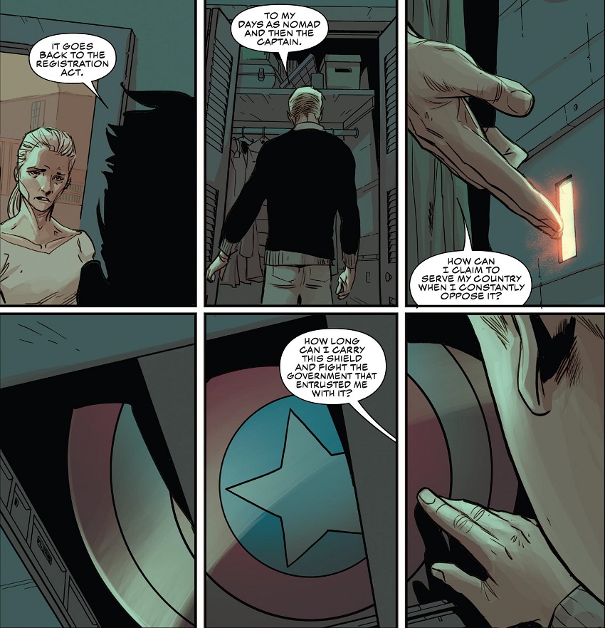 And this issue contains some nice character moments, too. When Captain America turns himself into the authorities, and Nick Fury Jr. asks him to turn over the shield, Cap is just like, “I lost it.” Nick retorts, “That’s a lie”, and Cap fires back, “What are you going to do, arrest me?” It’s a great scene that really puts Cap into solid perspective here. Just like his speech to Sharon that I posted a panel from above, about how he feels like he has no place in this current America. It’s a powerful speech that really digs in deep to the fascinating themes Coates is playing with, hence why I liked this issue so much.